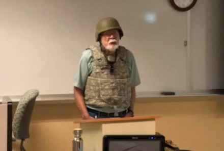 An attention-seeking college professor decided to make a statement last week by wearing combat gear to class on the first day of campus carry.